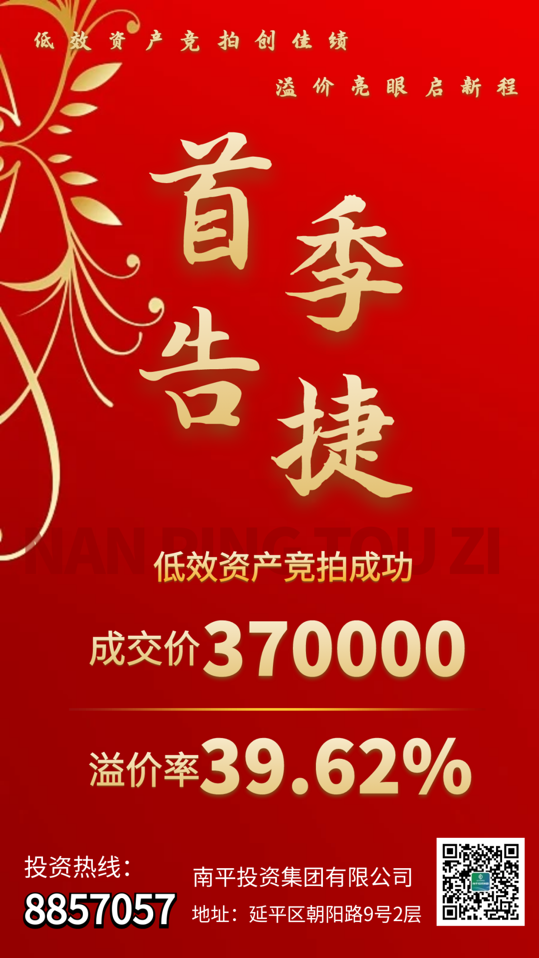 3月25日,投資集團(tuán)通過南平市產(chǎn)權(quán)交易有限公司公開掛網(wǎng)招租的福建省南平市蔬菜食雜公司后谷倉庫,采用網(wǎng)絡(luò)競價(jià)模式,吸引了4名投資者的激烈角逐。經(jīng)過多輪競價(jià),最終以37萬落槌,溢價(jià)率達(dá)39.62%,遠(yuǎn)超預(yù)期。 后谷倉庫的高溢價(jià)成交,不僅是資產(chǎn)盤活的一次突破,更標(biāo)志著公司市場化運(yùn)營能力邁上新臺階。此次成交充分彰顯市場對公司優(yōu)質(zhì)資產(chǎn)的認(rèn)可,不僅直接拉動公司資產(chǎn)收益增長,更展現(xiàn)了資產(chǎn)運(yùn)營團(tuán)隊(duì)的專業(yè)能力。 下一步,公司計(jì)劃將更多低效資產(chǎn)進(jìn)行整合升級,通過定制化招商與多元化合作模式,推動資產(chǎn)增值與運(yùn)營效率雙提升,為全年業(yè)績目標(biāo)達(dá)成提供堅(jiān)實(shí)保障。公司將以“拼”的干勁、“搶”的姿態(tài)、“實(shí)”的作風(fēng),奮力書寫高質(zhì)量發(fā)展新篇章!